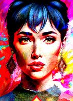 Een opvallend pop-art portret dat glamour en moderne expressie samenbrengt. De combinatie van halftone structuren, rijke kleuren en schilderachtige texturen maakt dit kunstwerk een echte blikvanger in elk interieur.