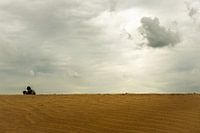 Fluweel lijkt het zand in deze zandverstuiving. De lucht geeft het een bijna surrealistisch effect. De man geeft een stukje diepte aan deze bijzondere foto