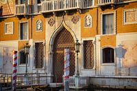 Dit is een van de vele kleurrijke en versierde gevels in Venetië. Het lijkt wel alsof bij de bouw van elk huis in Venetië op sierlijke details is gelet. Sommige details lijken uit de islamitische architectuur te komen, andere meer uit de Byzantijnse architectuur.