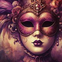 Een digitaal kunstwerk van een Venetiaanse masker, dat traditioneel gedragen wordt tijdens carnaval. Het is gemaakt in een vintage stijl, die doet denken aan de oude klassieke schilderijen. Het masker is versierd met grote veren, kralen en bloemen.