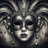 Een digitaal kunstwerk van een Venetiaans masker, dat traditioneel gedragen wordt tijdens carnaval. Het is gemaakt in een vintage stijl, dat doet denken aan de oude klassieke schilderijen. Het masker is versierd met grote veren. De kleuren zilver, grijs en zwart zorgen voor een chique uitstraling van uw interieur.