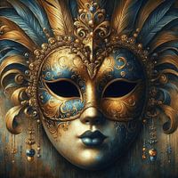 Een digitaal kunstwerk van een Venetiaans masker, dat traditioneel gedragen wordt tijdens carnaval. Het is gemaakt in een vintage stijl, dat doet denken aan de oude klassieke schilderijen. Het masker is versierd met grote veren en kralen. De warme kleuren goud, brons en licht blauw geven een chic accent in je interieur.