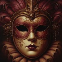 Een digitaal kunstwerk van een Venetiaans masker, dat traditioneel gedragen wordt tijdens carnaval. Het is gemaakt in een vintage stijl, dat doet denken aan de oude klassieke schilderijen. Het masker is versierd met grote veren en kralen. De kleuren brons, goud, bruin en warm rood zorgen voor een chique uitstraling van uw interieur.
