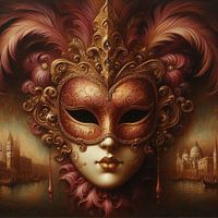 Een digitaal kunstwerk van een Venetiaans masker, dat traditioneel gedragen wordt tijdens carnaval. Het is gemaakt in een vintage stijl, dat doet denken aan de oude klassieke schilderijen. Het masker is versierd met grote veren en kralen. Op de achtergrond is een impressie van de stad te zien. De kleuren brons en bruin zorgen voor een…