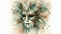 Een digitaal kunstwerk van een vrouwelijk portret met een Venetiaans masker. Het is gemaakt in de losse en vloeiende stijl van een aquarel in verschillende kleuren.