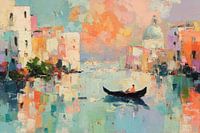 Een abstract olieverfschilderij van de romantische stad Venetië, geschilderd in zachte pastelkleuren. In het midden drijft een elegante gondel op het water, omringd door delicate lichtreflecties en impressionistische details. De levendige impasto-techniek en zachte penseelstreken geven het werk diepte en structuur. Dit kunstwerk vangt…