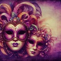 Een digitaal kunstwerk van twee Venetiaanse maskers, die traditioneel gedragen worden tijdens carnaval. Het is gemaakt in een vintage stijl, die doet denken aan de oude klassieke schilderijen. De maskers zijn versierd met grote veren, kralen en bloemen.