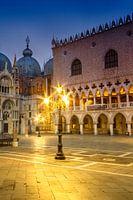 Venetië is gebouwd op meer dan 100 eilanden in het midden van een lagune. Deze eilanden zijn met elkaar verbonden door meer dan 400 bruggen, meer dan 150 kanalen dienen als wegen. Het San Marco-plein is het belangrijkste en beroemdste plein van Venetië. Het werd al in de 9e eeuw gebouwd. Prachtig uitzicht op het Dogenpaleis en de San Marco-kathedraal - verlaten op het blauwe uur kort voor zonsopgang. Een dromerige sfeer!