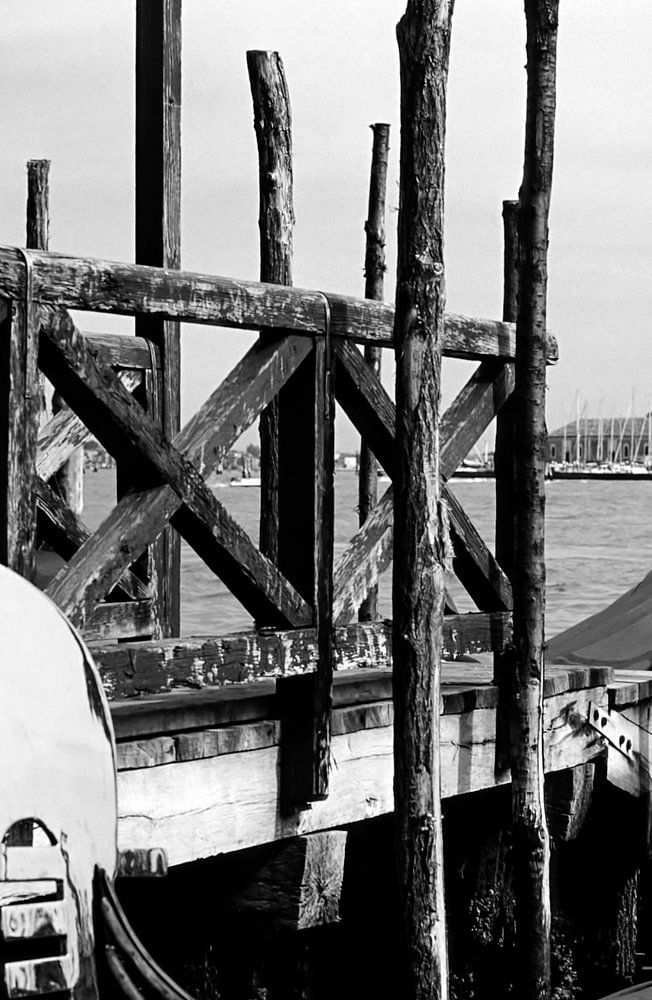 Deze sfeervolle zwart-witfoto toont een klassieke Venetiaanse gondel die rustig voor anker ligt op een houten steiger. Het spel van licht en schaduw benadrukt de textuur van het verouderde hout en het wateroppervlak, waardoor het motief een tijdloze, bijna nostalgische sfeer krijgt. Perfect voor liefhebbers van Italiaanse romantiek en klassieke fotografische kunst.