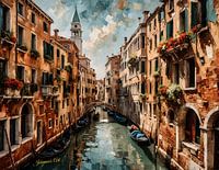 Een schilderachtig Venetiaans kanaal wordt afgebeeld, geflankeerd door historische gebouwen met luiken en versierd met levendige bloembakken. Gondels liggen aangemeerd langs de randen van het kanaal, onder sierlijke bruggen die de smalle paden van Venetië verbinden, onder een heldere hemel met een vleugje iconische architectuur van de stad op de achtergrond.