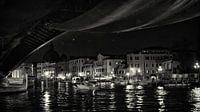 Blik onder een brug door op steigers met aangemeerde boten op een van de brede kanalen in de Italiaanse stad Venetië.