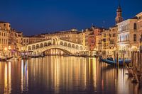 Ponte Rialto in de gloed van de lichtjes van Venetië op het blauwe uur.
