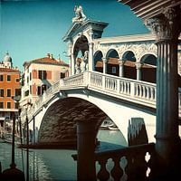 Een schilderij van de prachtige Rialtobrug in Venetië, met witte stenen bogen die elegant een rustig, turquoise kanaal overspannen. De gedetailleerde architectuur met beelden en versieringen wordt benadrukt door het felle zonlicht. Kleurrijke gebouwen met luiken omzomen de oevers. Op de voorgrond suggereren architecturale elementen het perspectief van een waarnemer. Het heldere blauw van de lucht contrasteert prachtig met de warme kleuren van de stad. De scène brengt de tijdloze schoonheid en het architectonische meesterwerk van Venetië over.