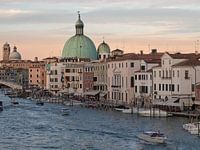 Sfeervolle foto bij zonsondergang van het Riva de Biasio-Ferrovia op de voorgrond en de markante koepel van het Franchetti Paleis op de achtergrond.