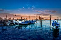 Een mooi koel sfeertje tijdens het bekende blauwe uurtje na zonsondergang in Venetië, Italië. De gondels dansen in het water.