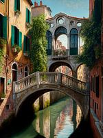 Een rustig Venetiaans kanaal baant zich een weg onder een stenen boogbrug waarvan de delicate balustrades zich elegant over het groene water uitstrekken. De omringende gebouwen in warme gele en rode tinten rijzen schilderachtig op, hun ramen hebben groene luiken en worden omlijst door weelderig groen. Het spiegelende water vangt de zachte kleuren van de architectuur en de helderblauwe lucht, bezaaid met delicate wolken. Het tafereel ademt een vredige en tijdloze sfeer uit, een verborgen juweeltje in het centrum van de beroemde stad aan het water. De rust van het kanaal contrasteert met de stenen duurzaamheid van de brug en de levendige vegetatie.