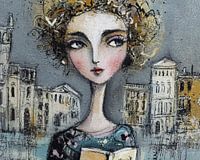 Venetië schilderij - In dit portretschilderij zie je een vrouw met een boek in haar handen, terwijl de stad op de achtergrond, waarschijnlijk Venetië, zichtbaar is, met een bijzondere focus op haar gedetailleerde gezicht en speelse haarstijl.