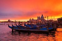 Venetië bij zonsondergang. Skyline met gondels en de Basiliek Van Santa Maria della Salute nabij het San Marcoplein. In de verte het eiland Giudecca onder de oranje en geel gekleurde wolken.