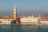 Zicht op het Piazza San Marco in Venetië, Italië. Stadsgezicht met het beroemde Dogepaleis in de stad omgeven door water.
