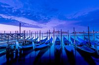 Een mooi koel sfeertje tijdens het bekende blauwe uurtje na zonsondergang in Venetië, Italië. De gondels dansen in het water.