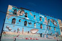 Rip Cronks Venice Beach-versie van Sandro Botticelli's "Birth of Venus" (circa 1485) is een restauratie in 2010 van zijn originele muurschildering uit 1989 op dezelfde locatie, voorheen getiteld "Venice Reconstituted."