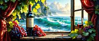 Dit panoramische schilderij ontvouwt een stilleven van zeldzame intensiteit - een poëtische samensmelting van een sensuele innerlijke wereld en een dramatisch natuurlijk landschap. Links op de foto staat een fles rode wijn met een vergeeld etiket op een verweerde vensterbank, omlijst door mollige, dieprode druiven die een echo lijken van vroegere oogsten. Het rechtergedeelte van de foto toont een halfgevuld wijnglas, verstrengeld met wijnranken en druiven - een symbool van blijven hangen, genieten, herinneren.