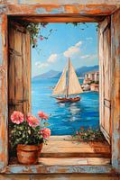 Een venster in een droomwereld: zachte golven spelen rond een zeilboot voor een pittoresk kustplaatsje. De helderblauwe kleuren van het water contrasteren levendig met de bloeiende planten die de vensterbank sieren. Hier ontmoet de geur van bloemen het zout van de zee - een uitzicht dat de ziel verfrist.