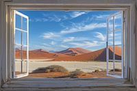 Ervaar de adembenemende schoonheid van de woestijn door dit indrukwekkende kunstwerk. De rode duinen en het briljante blauw van de lucht creëren een indrukwekkende achtergrond die perfect wordt geaccentueerd door het open raam. Ideaal voor avonturiers en liefhebbers van unieke landschappen. Dit decor brengt een exotische en inspirerende sfeer in elke kamer. Perfect voor de woonkamer, kantoor of slaapkamer, dit beeld creëert een verbinding met de indrukwekkende uitgestrektheid van de natuur.