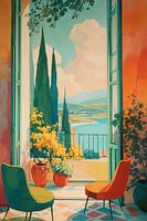 Een kunstwerk dat een intiem moment vastlegt: twee stoelen uitnodigen je uit in een warm interieur met terracotta muren, terwijl een openstaand raam met groen kozijn een adembenemend landschap onthult. Cipresssen steken fraai af tegen zachte wolken, gele bloemen fluisteren van zomerse dagen, en de lichte poëzie van het licht creëert een…