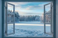 Dompel jezelf onder in de vredige schoonheid van een besneeuwd winterlandschap, vastgelegd door een open raam. De ongerepte sneeuwdeken en helderblauwe lucht creëren een rustgevende sfeer die perfect is voor elke kamer. Deze scène is ideaal voor natuur- en winterliefhebbers en brengt een verfrissende en contemplatieve sfeer in je woonkamer, slaapkamer of kantoor. Deze foto is perfect voor winterdecoratie en creëert een kalme en serene sfeer.