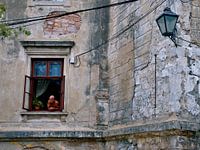 Een rokende man hangt door het raam naar buiten en ziet dat het goed is