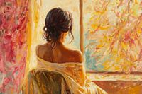 De scène is vastgelegd in zachte aardetinten en straalt een melancholische rust uit. Een vrouw, gehuld in zachte lichtstralen, leunt tegen een raam terwijl gouden bladeren voorbij drijven in een winderige dans. Haar houding getuigt van bedachtzame introspectie, terwijl de buitenwereld bloeit in levendige kleuren - een harmonieus…