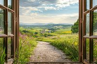 Geniet van het idyllische uitzicht op een zacht, bloeiend landschap door een open raam. Deze prachtige poster brengt de vredige en ontspannen sfeer van het plattelandsleven in je woonkamer. Ideaal voor natuurliefhebbers en iedereen die een rustige en gezellige sfeer in huis wil creëren. De levendige kleuren en rijke details maken het een perfect decoratiestuk.