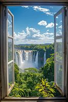 Geniet van de indrukwekkende aanblik van een majestueuze waterval door een open raam. Deze prachtige poster brengt de krachtige en verfrissende sfeer van de natuur in je woonkamer. Ideaal voor natuurliefhebbers en iedereen die een dynamische en rustgevende omgeving wil creëren. De levendige kleuren en rijke details maken het een perfect decoratiestuk.