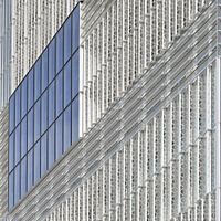 schilderij van ramen in gebouw in grijs en blauw tinten