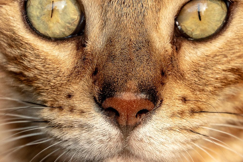 Deze close-up foto legt de doordringende en mysterieuze ogen van een huiskat vast, met een scherpte die elk detail van de vacht en de weerspiegeling in de ogen benadrukt. De gouden tinten van de kat's iris harmoniëren met het natuurlijke licht, waardoor een gevoel van warmte en nieuwsgierigheid wordt gecreëerd. Dit portret toont de ongekende schoonheid en complexiteit van onze katachtige metgezellen, en nodigt uit om dieper te kijken dan het oppervlak.