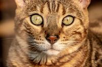 Deze close-up foto legt de doordringende en mysterieuze ogen van een huiskat vast, met een scherpte die elk detail van de vacht en de weerspiegeling in de ogen benadrukt. De gouden tinten van de kat's iris harmoniëren met het natuurlijke licht, waardoor een gevoel van warmte en nieuwsgierigheid wordt gecreëerd. Dit portret toont de…
