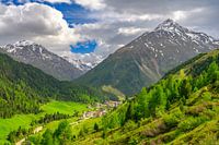 Uitzicht op het bergbeklimmersdorp Vent in de Ötztal vallei in Tirol Oostenrijk tijdens een mooie lentedag in de Alpen. Vent is een van de Bergsteigerdorpen in de Oostenrijkse Alpen. "Bergsteigerdorf" vertaalt van het Duits naar het Engels als "bergbeklimmersdorp" of "bergbeklimmersdorp." Deze dorpen liggen meestal in bergachtige gebieden en zijn gewijd aan het bevorderen van duurzaam en verantwoord bergbeklimmingstoerisme.