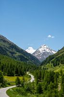 Venteraal landschap bij Heiligkreuz in de Ötztal regio Tiol in de Oostenrijkse Alpen tijdens een mooie lentedag in de bergen. Een kronkelende weg leidt naar de besneeuwde Kreuzspitze op de achtergrond.