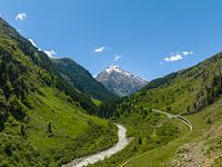 Venter tal landschap bij Heiligkreuz in de Ötztal regio Tiol in de Oostenrijkse Alpen tijdens een mooie lentedag in de bergen. De weg en de rivier de Venter Ache leiden het uitzicht naar de berg Kreuzspitze op de achtergrond.