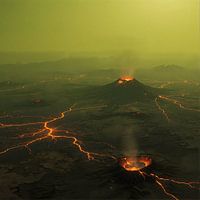Ishtar Terra is een van de grootste hooglandgebieden op Venus, gekenmerkt door vulkanische activiteit en een ruw, vurig landschap. De omgeving is zeer onherbergzaam, met temperaturen rond 450 graden Celsius en een druk van ongeveer 92 bar - gelijk aan de druk op een diepte van ongeveer 920 meter. Deze foto toont het dramatische oppervlak dat wordt gevormd door stromende lava en enorme vulkanen.