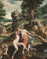 Venus, de godin van de liefde, wil haar minnaar Adonis niet op jacht laten gaan. Ze is bang dat hem iets zal overkomen. Haar angst komt uit: een everzwijn doodt Adonis. De lange slanke figuren met kleine hoofden zijn kenmerkend voor Sprangers elegante maniëristische stijl. Het landschap is merkwaardig ouderwets: het is gekopieerd naar een vroeg-16de-eeuws schilderij.