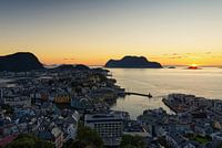Zicht op Ålesund in de schemering vanaf de uitkijkberg Aksla