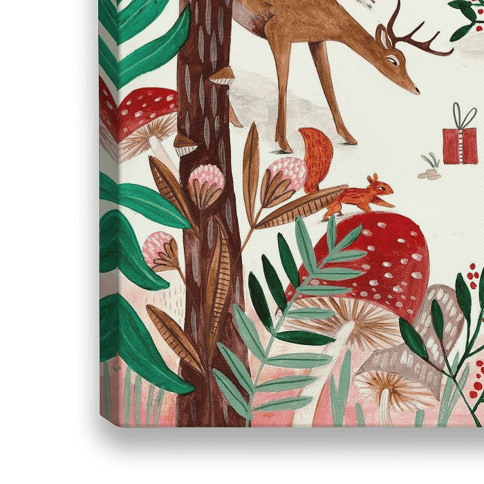 Een schattige kinder illustratie in een kerst bos met dennenbomen. Het is winter, misschien al bijna kerstmis en de dieren, een hert, vos, eekhoorntjes een konijn en een haas vinden een verassing. Het heeft gesneeuwd het bos is with en de dennenbomen staan om hun heen.