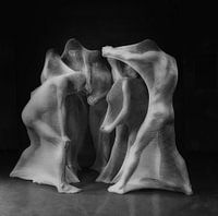 Groepsbeeld van studenten beeldhouwen van de Gerrit Rietveld academie. Samen in het verbandgaas.