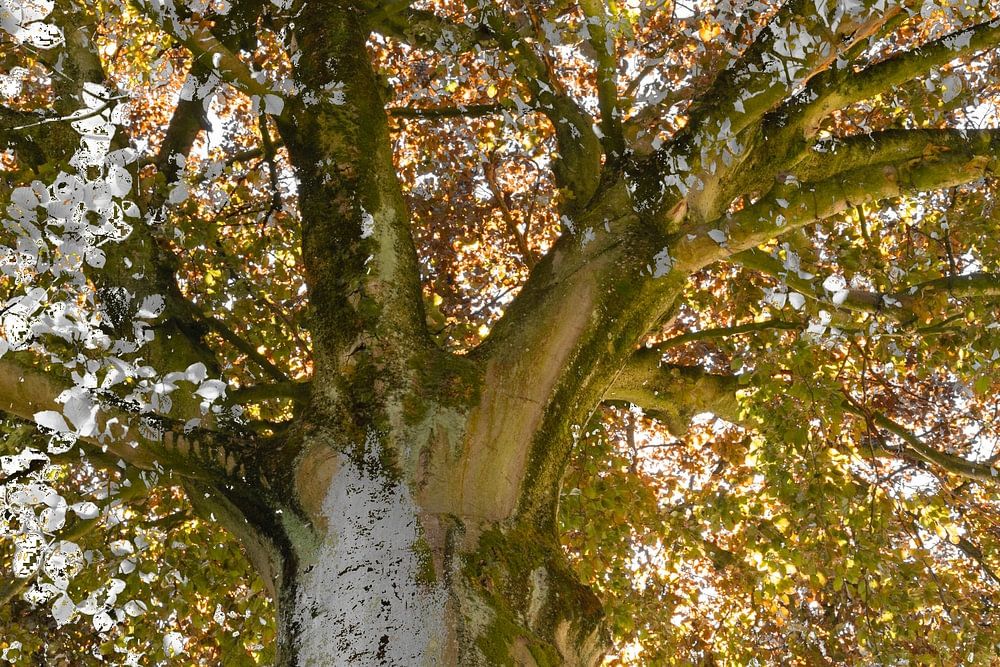 De foto's van de twee verschillende lindebomen zijn met elkaar gemixt. Zodoende zijn de twee bomen met elkaar verbonden. De bomen zijn samengesmolten tot één geheel.