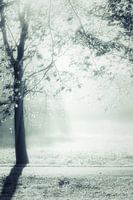 Een straffe najaarszon wordt versterkt door de ochtennevel en geeft een oogverblindende gloed over het veld en de bomen