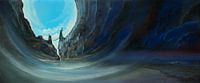 Dit schilderij neemt de kijker mee naar een fascinerende en mysterieuze wereld waarin het spel van licht en duisternis centraal staat. De scène speelt zich af in de diepte van een enorme grot en fascineert door de artistieke weergave van dit contrast.