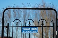 Close-up van verboden toegangscode, hekwerk met spijlen en prikkeldraad.