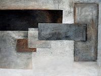 Een abstract schilderij waarbij er hoop gloort achter de horizon. De verbinding tussen de objecten heeft een serene rustgevende uitstraling.